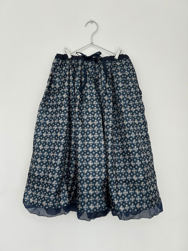 かすり織の生地をスキャンして転写したと思われるデジプリ。 アンティークとは異なる趣きのハリがあるポリエステル生地です。 このような「再現」には賛否両論があると思いますが インドの一般的なアパレル生地の中に次第に増えているような気がします。 (アトリエマニス的にはアンティーク再現はアリだとしても できればポリ以外の生地で、と、現在別案試作中です。) ポリの特性からふんわりしたスカートを作りました。 裾の内側にゴムを入れてバルーン風の仕立てに。 裏地には夏用ポリのサップという生地の濃紺を合わせ 裾はシルクオーガンジー、ウエスト紐はポリオーガンジー。 昔一回だけ買ったコムデのポリのサルエルが一生ものになったことを うっすら思い出して ポリでも作ってみようと相成りました。 インディゴブルーに雪の結晶みたいなクロス柄がなかなかです。 両サイドにポケット、着脱用の開閉部分はなくゴムを伸ばして履いて ウエスト紐を縛るパジャマパンツみたいな着方です。 フリーサイズ 表スカート、裏地:ポリエステル100% 裾部分:シルク100% ウエスト幅= 着丈=65cm 裾幅= (申し訳ございません各サイズただいま確認中です) 水洗いされる際は手押し洗いでハンガードライをお勧めします。 裾のオーガンジーは洗うたびにハリが失われますが 仕上げアイロンをすると若干硬さが戻ります。
