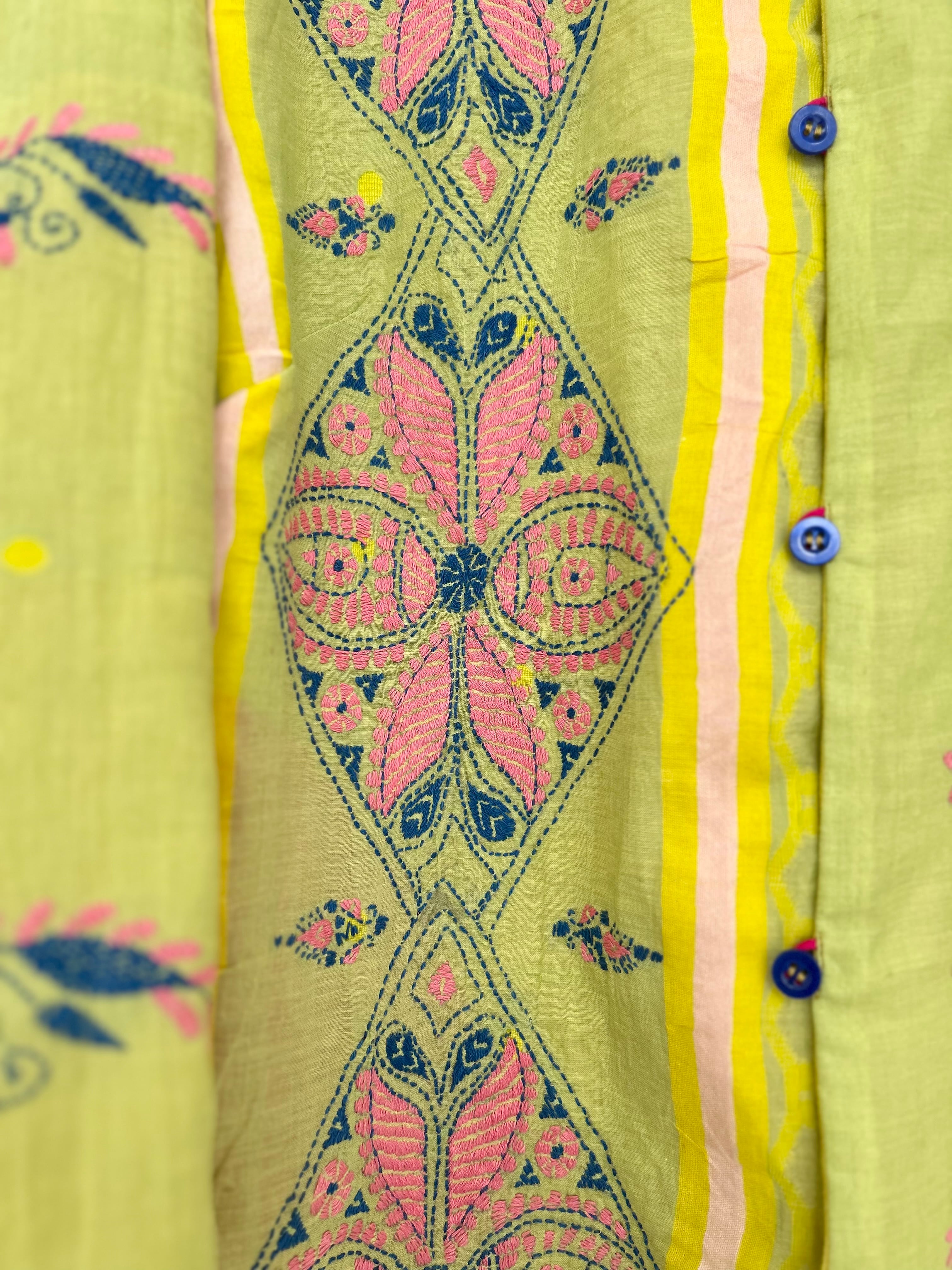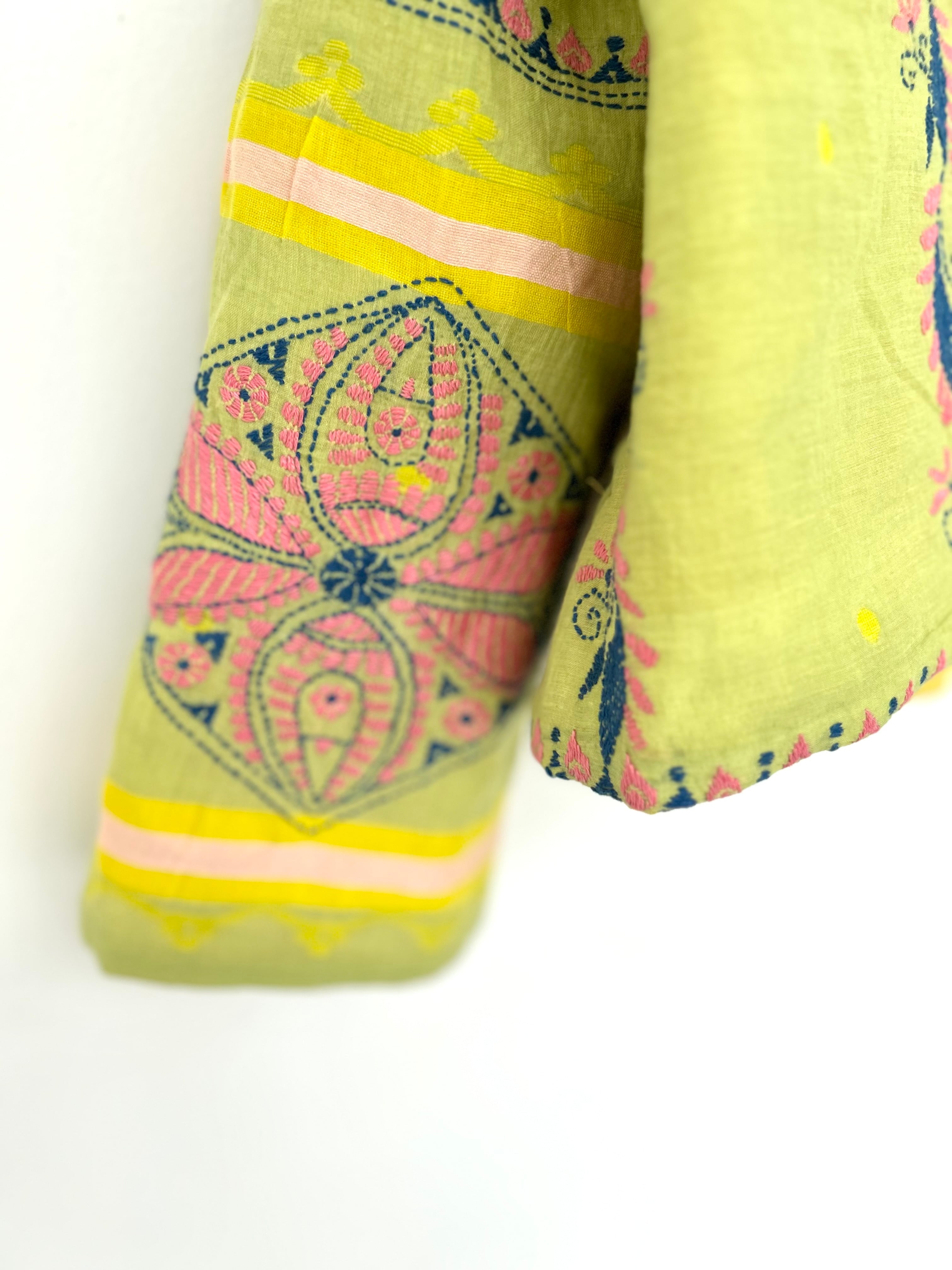 さすが産地!なのですがこの優しい配色の手仕事が薄いモスリンに惜しげもなく丁寧に盛り込まれていることに作者のセンスと愛情を感じます。
